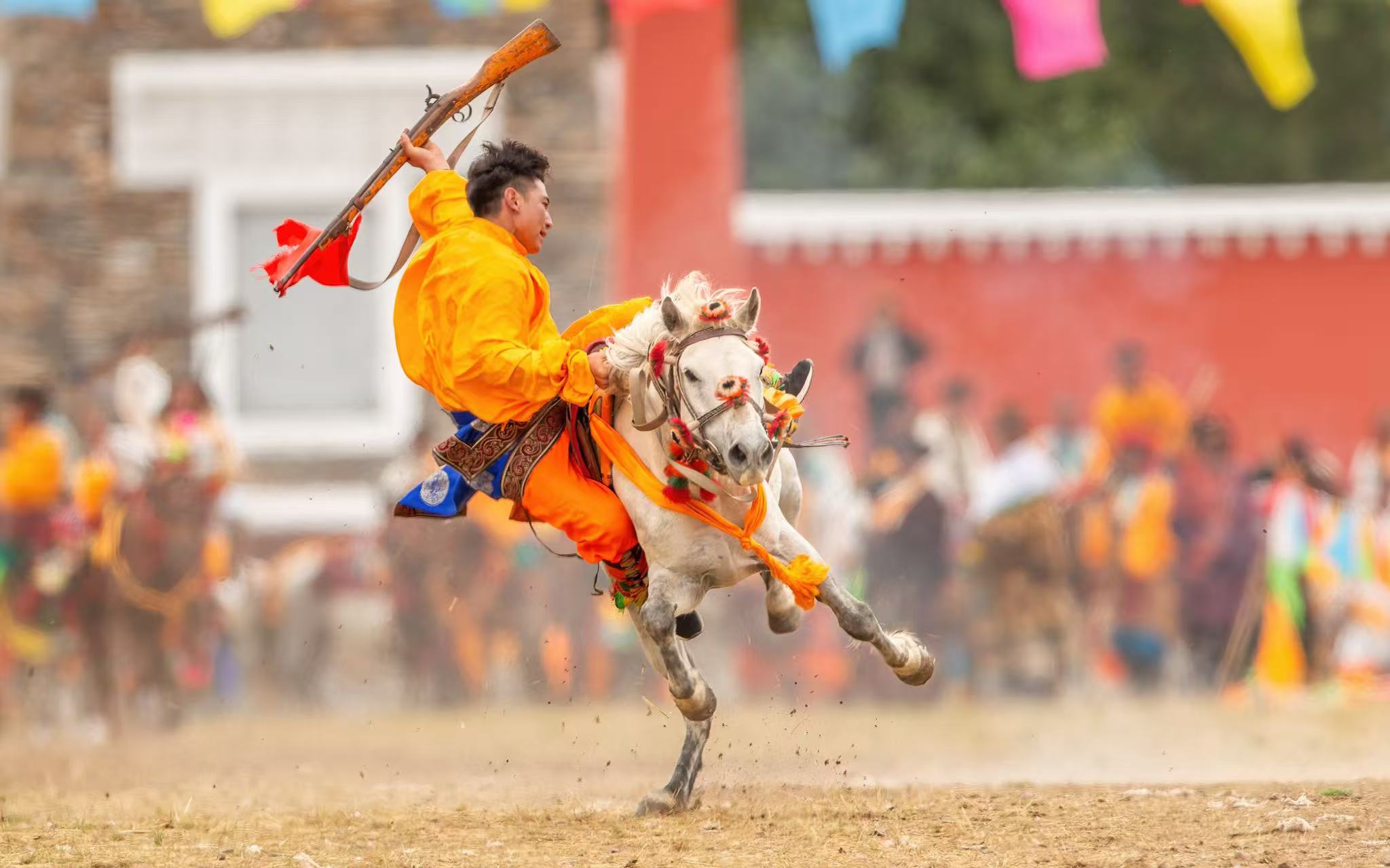 每年7月,玉树赛马节如期而至。煨桑启幕,传承传统之魂,千名骑手身着盛装藏袍,背传统火枪,马蹄踏出的烟尘如金色河流。极限马术展演震撼人心,“跑马悬体”项目中,骑手仰面悬挂马侧,疾驰如风;“马上拾哈达”对决里,骑手俯身,长辫与流苏划出银弧。