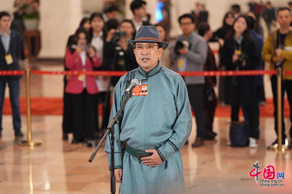 全国政协十四届三次会议第三场“委员通道”集体采访活动中,全国政协委员、内蒙古自治区锡林郭勒盟苏尼特左旗乌兰牧骑队长阿拉腾达来接受媒体采访(摄影:中国网 郑亮)