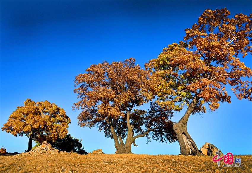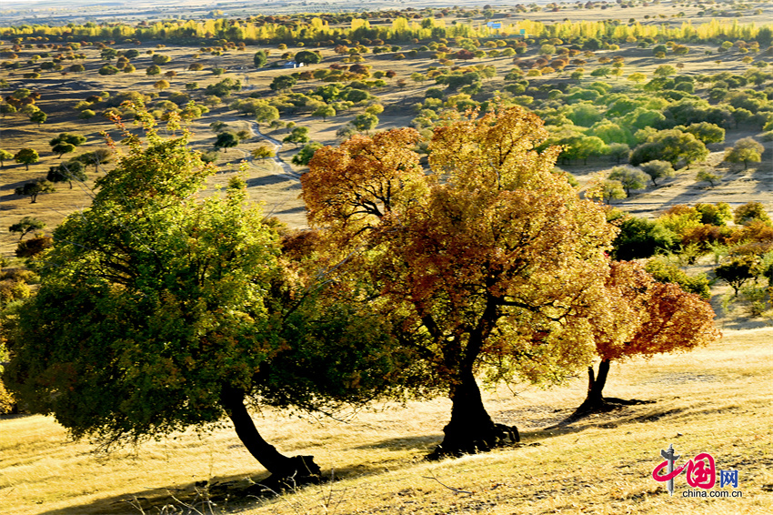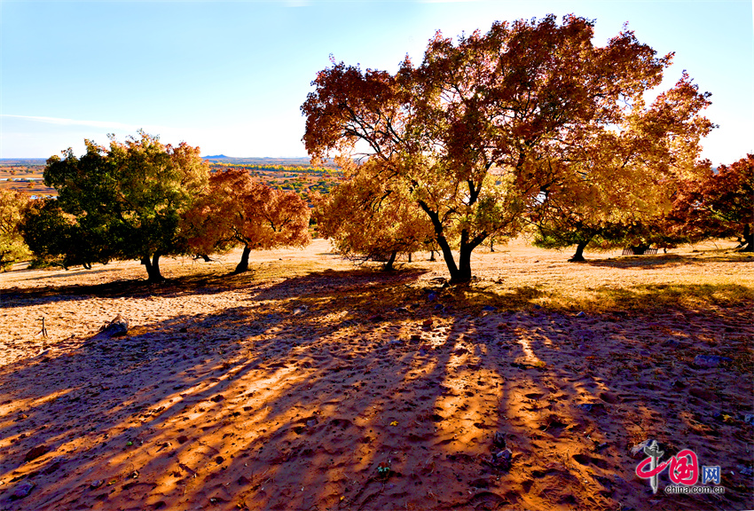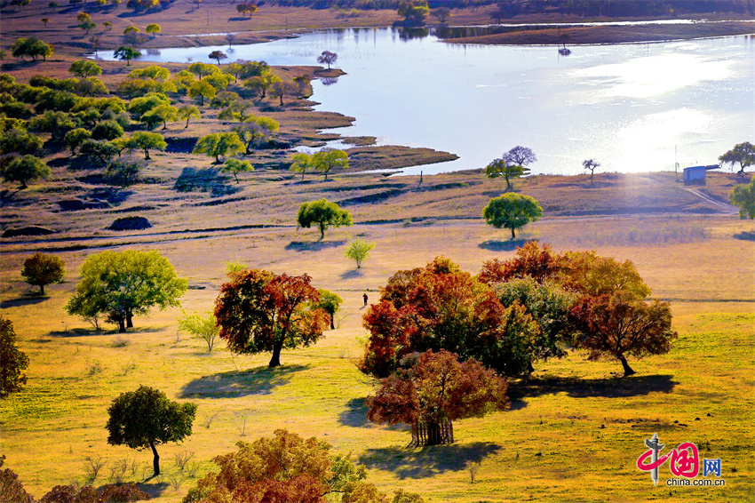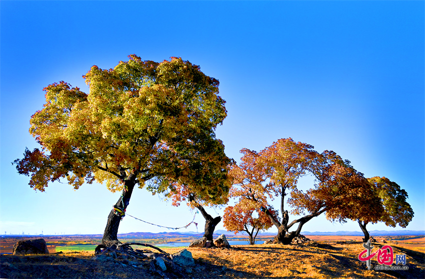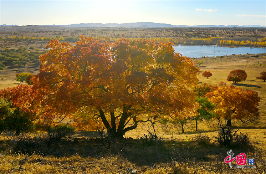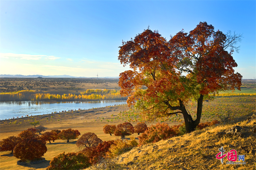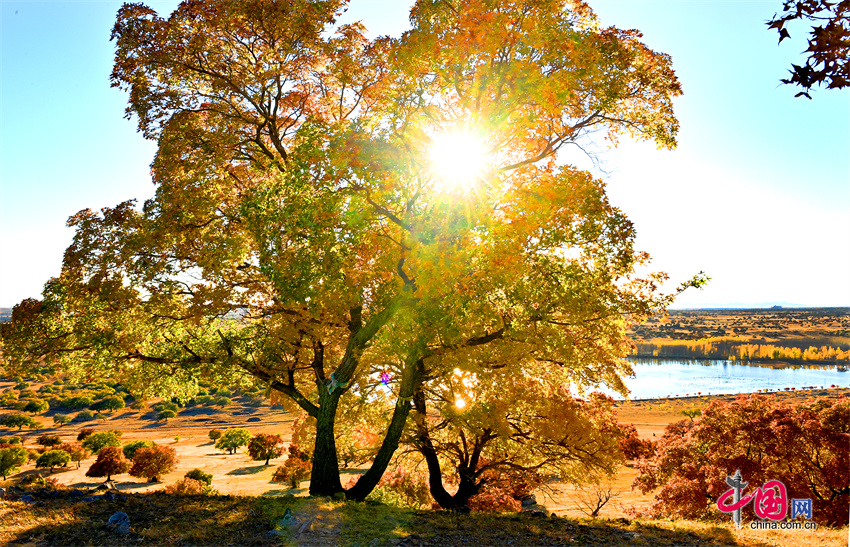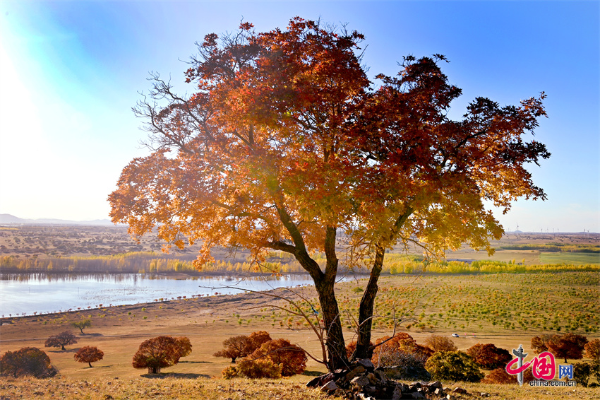 在科右中旗代钦塔拉五角枫自然保护区内,一棵棵五角枫树形舒展、枝繁叶茂,正逐渐褪去夏日绿衣、换上金秋华服。秋阳照耀下,层层叠叠的叶片色彩斑斓,红的像火、橙的像霞、黄的如金,在湛蓝的天空、宁静的秋水衬托下宛如一幅油画,丰富的色彩将大地点染得如同锦绣、尽显“枫情”。