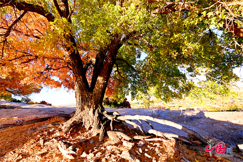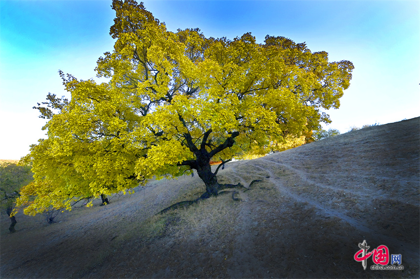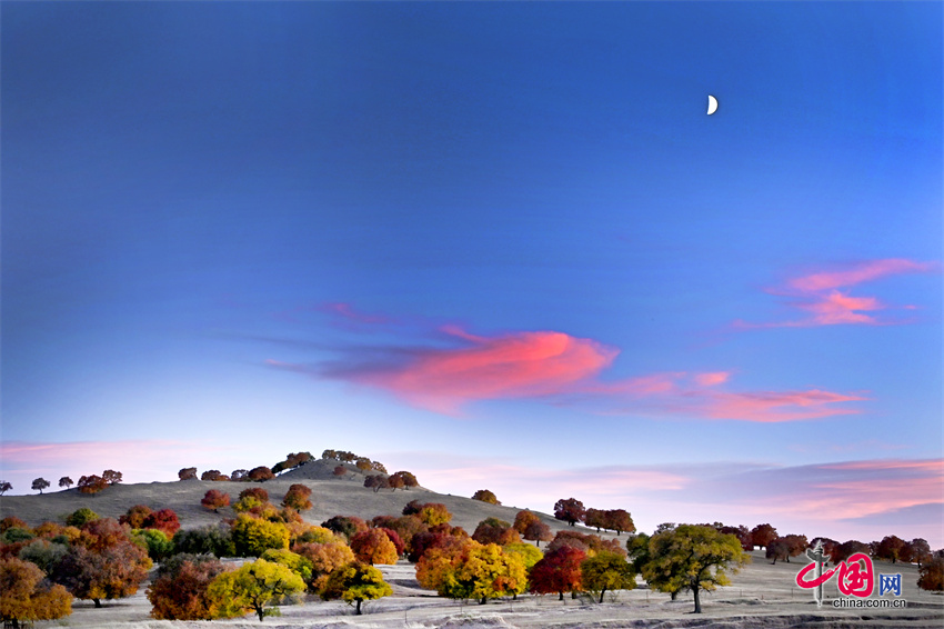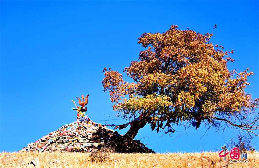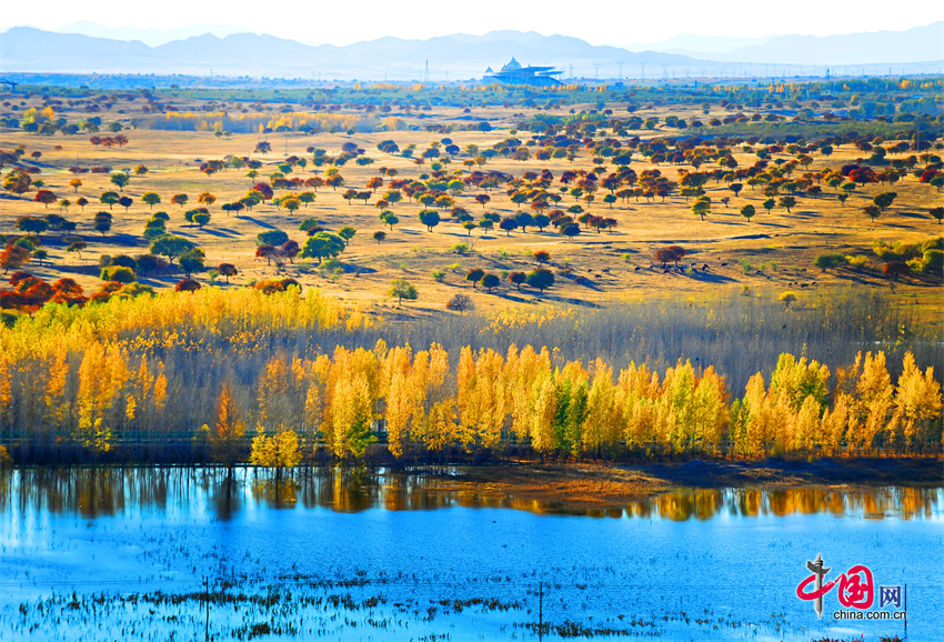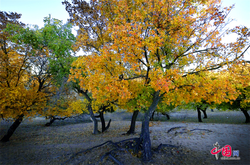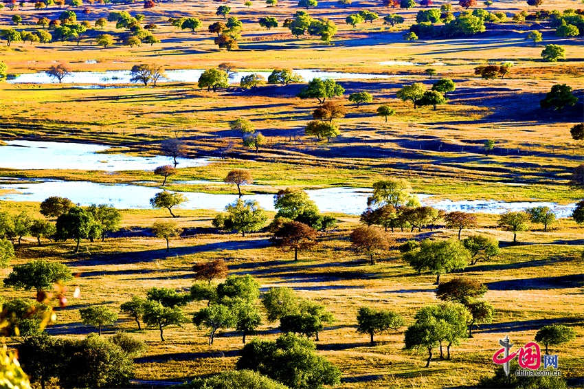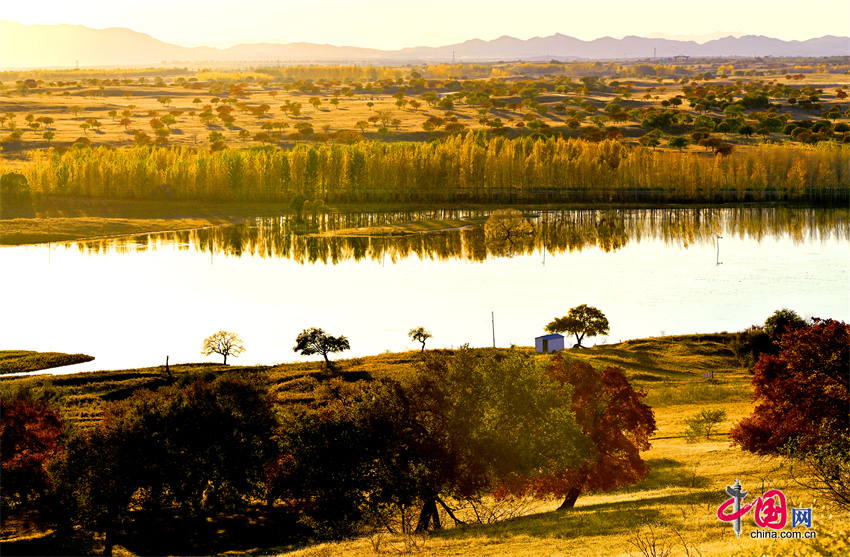 在科右中旗代钦塔拉五角枫自然保护区内,一棵棵五角枫树形舒展、枝繁叶茂,正逐渐褪去夏日绿衣、换上金秋华服。秋阳照耀下,层层叠叠的叶片色彩斑斓,红的像火、橙的像霞、黄的如金,在湛蓝的天空、宁静的秋水衬托下宛如一幅油画,丰富的色彩将大地点染得如同锦绣、尽显“枫情”。