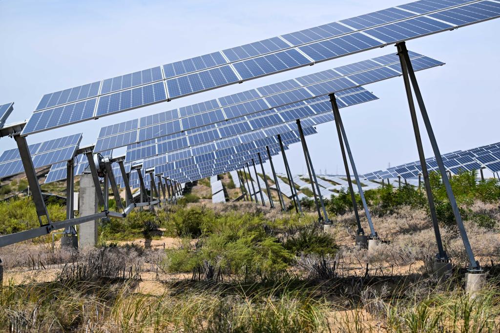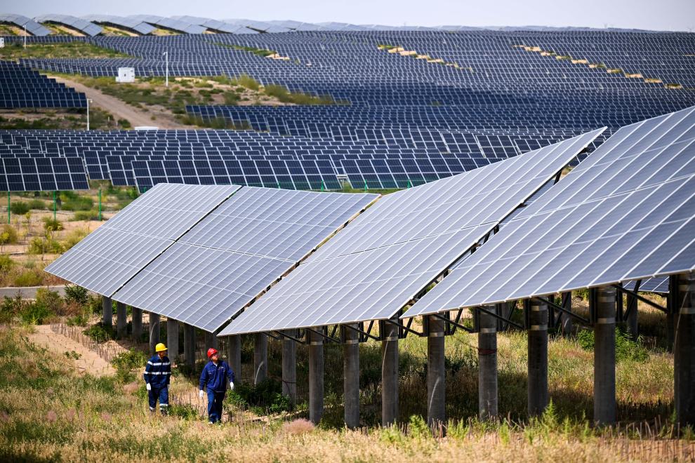 9月10日,工人在位于库布其沙漠的达拉特旗光伏基地巡检(摄影:新华社记者李志鹏)