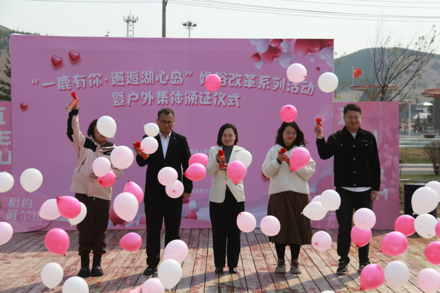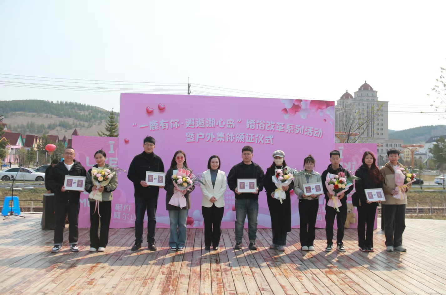 5月20日,“一鹿有你・邂逅湖心岛”活动热闹举办——5对新人身着简约礼服,在亲友嘉宾的见证下宣读新时代婚姻誓词,“自愿婚事新办、喜事简办,抵制铺张浪费”的倡议声在湖畔回荡。仪式后,有奖问答、筷子夹球接力赛等互动环节让现场充满欢笑。“今天和这么多新人一起许下承诺,还参与了有趣的游戏,特别难忘、有意义。”市民白敬华由衷感慨。“活动让婚俗改革的理念更加深入人心,帮助大家树立正确婚恋观和家庭观,让文明风俗走进千家万户。”阿尔山市民政和退役军人事务局副局长木仁说。