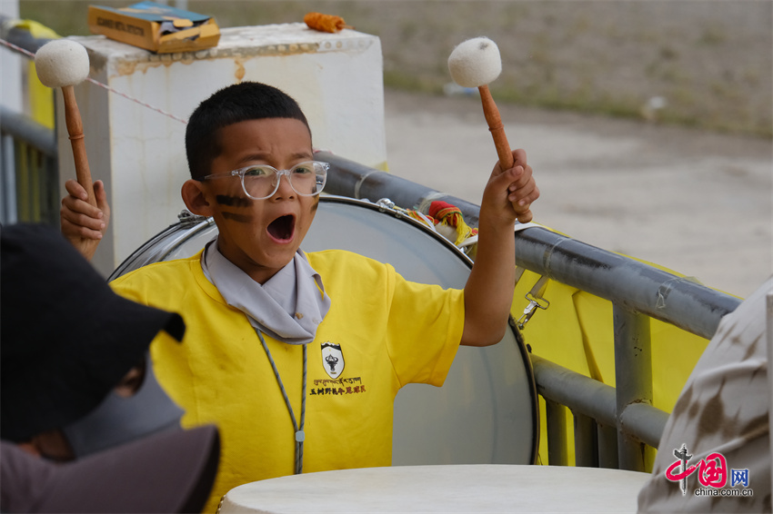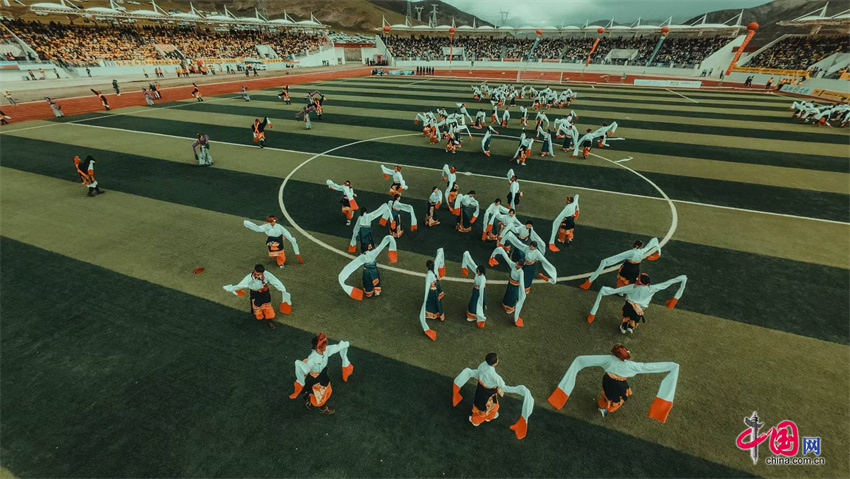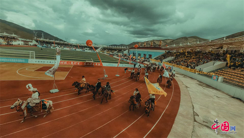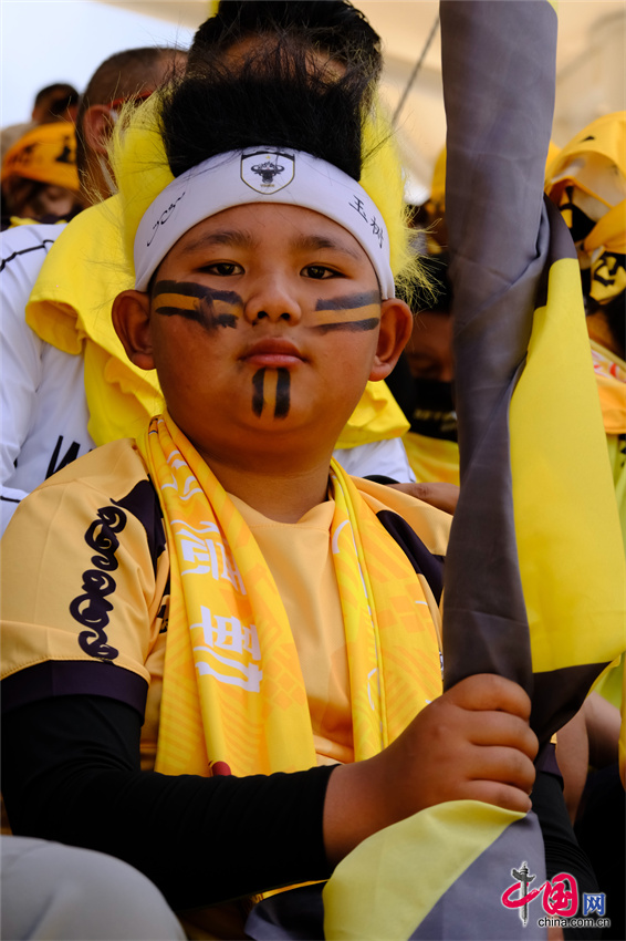 开赛前,体育场化身为展示玉树文化魅力的盛大舞台,称多县嘉塘马术艺术表演队身着盛装为现场观众献上精妙绝伦的“马上功夫”,100名本地骑手英姿勃发,身着节日盛装,手持主队旗帜,在观众的呐喊声中策马扬鞭绕场奔腾一周。非遗瑰宝白龙卓舞、雪吾武士舞和伊舞也接连亮相,骏马嘶鸣、蹄声如雷、歌舞助阵,雪域高原独有的力与美完美诠释了“马术之乡”对足球运动的热情与祝福,为主场作战的玉树牦牛队注入了强劲的精神助力。