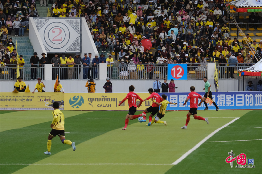 在浓郁的民族文化氛围和山呼海啸般的助威声中,比赛正式打响。被称为“高原黄魔”的玉树牦牛队挟主场之威,一开场便展现出强烈的进攻欲,球员们配合默契,多次向果洛格萨尔队的球门发起有威胁的进攻。果洛格萨尔队不愧“高原红魔”之名,防守硬朗,反击犀利,双方在中场展开了寸土不让的激烈绞杀。比赛高潮迭起,扣人心弦。最终,凭借下半场一次精妙的团队配合撕开对手防线,玉树牦牛队47号球员扎西成功破门,将比分定格在1:0并保持至比赛结束。