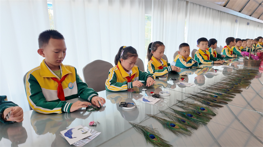 在乌兰浩特市义勒力特镇蒙雀养殖专业合作社,小朋友们展示孔雀羽毛手工艺品